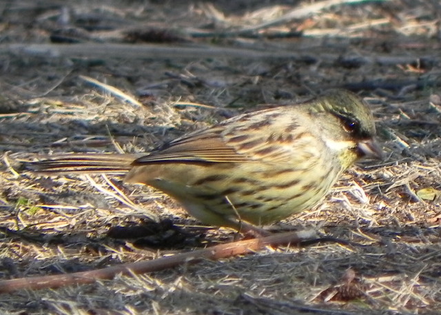 そんな空模様の下の調整池では、周囲を取り巻く歩道でアオジが熱心に、私が近付いてもなかなか逃げないくらい熱心にエサを探して食べていました。お陰で右上に載せたように大きく撮ることができましたが、昨日の雪でエサを十分探せなかったんだろうなと思うと、うれしさの反面、申し訳ない気もします。今日は日が当たりにくい南側の歩道や斜面を除いてほとんどの部分で雪がなくなっていたので、十分なエサを見付けられることを願っています。