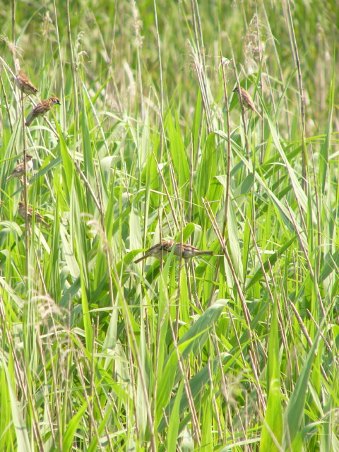 特に多く見かけたのが写真のスズメたちで、親離れして親の縄張りから追い出されて集まってきているようにも感じました。また、成鳥の羽に冠羽中らしいハクセキレイとツバメもいて、ツバメは写真のようなヨシやガマの茂みの中に不時着しているようでした。