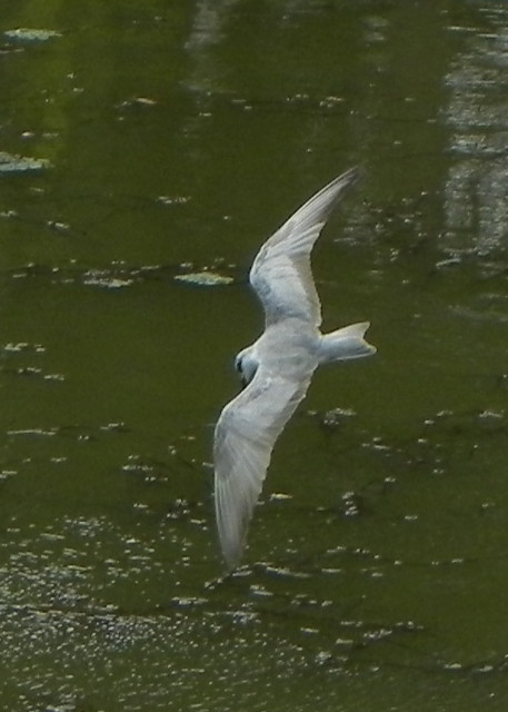 ハシブトアジサシは、調整池の開水面側の上空をクルクルと飛び回りながら、水面近くのエサを探し、何度もタッチダウンするように着水して(※1)エサを取っていました。最初は「白いツバメ?」と思いましたが、ツバメより二回りは大きく、ツバメより低空でダイナミックな機動をする姿に、すぐにテレビで見たことのあるアジサシの仲間ではと思い直しました。アジサシのような海鳥が調整池に滞在しているところを見るのは、カモメの仲間を含めても初めてでしたが、今まで見てきた調整池の鳥たちとはまったく違う迫力と存在感(※2)に、「他の鳥では?」という思いはまったく浮かびませんでした。結果としてこの判断が正しく、珍しいハシブトアジサシをじっくり見て、撮影できたことは本当に運が良かったと思います。