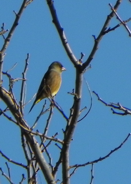 そして、東側のヨシやガマの茂みにはアオジが20羽くらいいるようでしたし、調整池周辺の灌木の中などからも鳴き声が結構聞こえました。今までの冬はこのアオジとスズメがヨシやガマの茂みを東西で分け合っている感じでしたが、今後はカワラヒワが加わって、三つどもえになるのかもしれません。