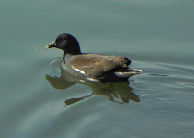 写真がその1枚で、成鳥とほとんど変わりませんが、頭部の羽根がちょっとふわふわした感じで、くちばしの根元も黒いことから、幼鳥と判断しました。ほぼ同時に成鳥とどちらか不明の個体も1羽ずつ見かけたので、今年の夏に見かけたバンが一家で冬を越しているという証拠をまた1つ得ることができました。今後も観察を続けて、さらに証拠を集めると共に、いつごろ幼鳥が親の縄張りである調整池から出て行くのか調べたいです。