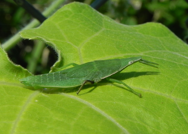 写真を撮れたのはアップしたバッタ1匹だけで、羽根が未発達なことから、どうもショウリョウバッタの幼虫のようです。なぜまったく動かないでジッとしていたのか不思議でしたが、今思うと、ジッと動かないことで私に気付かれないように、また、すぐに興味を無くしてどこかへ行くようにしていたのかもしれません。バッタは飛んで逃げるものと思い込んでいたので、この予想が当たっているとしたらちょっと新鮮な気持ちです。