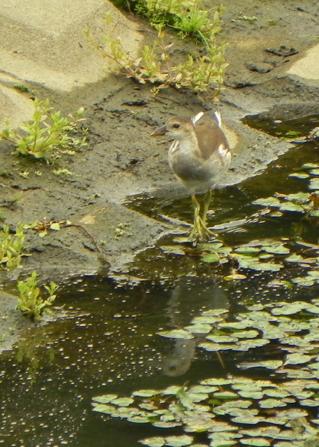 バン以外ではアイガモ兄弟の三郎が仁王立ちしているところを見たり、ヒヨドリ、ウグイス、カワラヒワの鳴き声を結構聞きましたが、会えた鳥の数は少なくて、スズメなどは1羽だけしか見かけませんでした。鳴かないで植え込みの中などに休んでいたために気付かなかっただけなのか、他の場所に移動しているのかは不明ですが、今日は雲もあって日差しが強くなく、あまり暑くなくて過ごしやすい感じの天気でしたし、もう少し多くの鳥たちに会いたかったです。