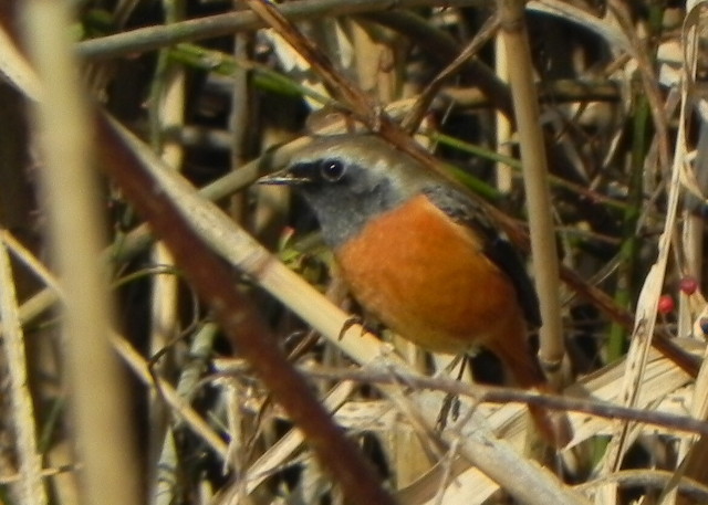 最後に、今年もジョウビタキのオスをヨシやガマの茂みの東側で見かけました。写真がそのオスで、もしかしたら、今年も同じ場所に縄張りを作るのかもしれません。昨年のオスと同じ個体なのかまでは分かりませんが、今年も観察を続けて、きれいに撮るチャンスを狙いたいです。