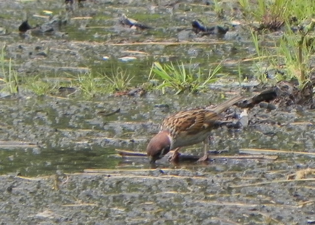 でも、その穴埋め以上にヒヨドリが賑やかでしたし、姿はほとんど確認できなかったものの、いろいろな鳥の鳴き声も聞けました。ヒヨドリは調整池の外側にいるようでしたが、ツバメとカワラヒワは調整池の上を何度も飛んでいました。また、繁殖のために住宅地へ移動していると思っていたスズメも、移動や休憩などなのか、それなりにいるようでした。もうしばらくすればオオヨシキリの鳴き声がしてもおかしくないですし、次回もしっかり耳を澄ませます。