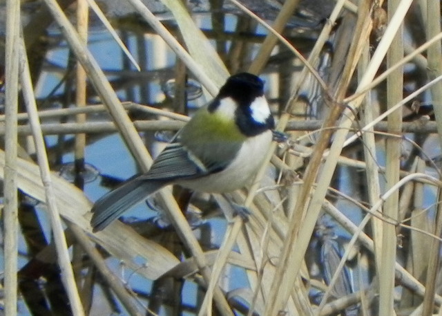 でも、鳥たちは結構いて、久し振りにコゲラの姿を確認したり、シジュウカラを撮ったりしました。写真はそのシジュウカラを撮った1枚で、4羽のグループがヨシやガマの茂みの主に南側でせっせとエサ(越冬中の小さな虫?)を探しているようでした。シジュウカラは特徴的な鳴き声と、エサを探しているときに立てる意外と大きな音(枯れたヨシやガマの葉を折ったりする音)、そして、特徴的な青、緑、白の模様で、いるのは分かっても、ヨシやガマの茂みで見えづらかったり、落ち着きなく動き回っていたりでなかなか撮れないでいたので、多少ピンぼけでそっぽを向いていても、全身を撮れて良かったです。