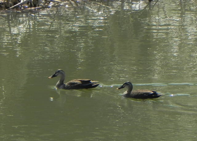 でも、カルガモが3羽飛んできて降りるところを見られました。このカルガモたちのほか、コガモやカワウもそうなのですけど、降りてくる前に上空を旋回することが多いようです。スズメやハクセキレイなどは調整池の周囲や外側の梢や電線といった高いところに一旦留まったりして調整池の様子を確認できるのに対して、水鳥はそういうことができないので、上空を旋回して様子を確認しているのだろうと気付きましたが、もしかしたら、それだけではないかもしれません。たとえば、スズメやハクセキレイなどは飛び立ってすぐに高度を上げられるので、危険からすぐに逃れることができます。ですが、コガモでも、すぐに高度を上げるのは難しいみたいで何度か上空を旋回したりしているので、より熱心に確認しているのかもしれません。また、スズメの場合は先に仲間(他のスズメ)が到着していることがほとんどなので、その鳴き声などで安全を確認できる分、すぐに降りてこられるのかもしれません。正解は分かりませんが、そんな気がしました。