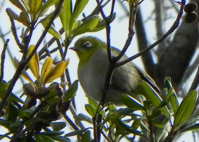 あと、久し振りに調整池でメジロを見ました。写真がそのメジロです。撮ったときはほぼ同じ場所に15羽ほどの群れでいたカワラヒワだろうと思っていたのですが、パソコンの画面で確認してみたらメジロでした。鳴き声でもカワラヒワと思っていましたが、メジロもきれいな声で鳴くみたいですね。逆光で撮ることが多くてなかなかきれいに撮れないので、次はぜひ順光で撮りたいです。