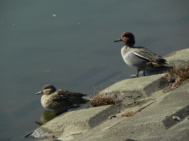 まず、コガモは私が調整池に到着する前から鳴き声が聞こえていて、オス5羽以上を含む15羽が開水面でにぎやかに過ごしていました。私を特に警戒してすぐに逃げるということもあまりなく、ペアで過ごすことを優先しているようでした。ぜひ、次回も姿をたっぷり見せてほしいです。