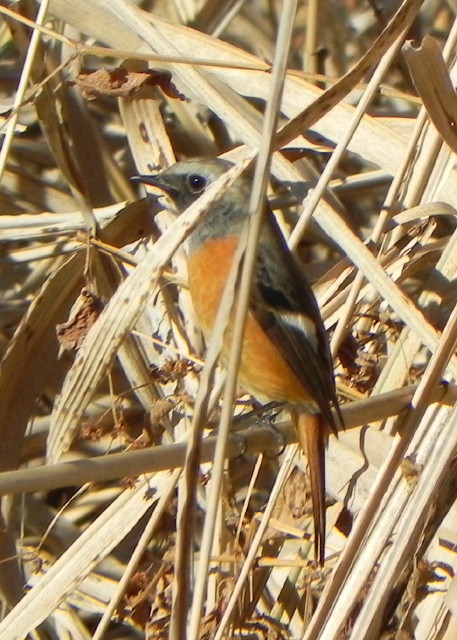 調整池でも、ジョウビタキのオスを始めとする鳥を見かけました。こちらも小さな虫を食べていたのか、多くの鳥はヨシやガマの茂みの南側周辺で見かけましたが、写真のジョウビタキのオスだけは茂みの東側で、じっとしているところを見かけました。今日に限らず、ジョウビタキのオスは茂みの東側で見かけることが多いので、多分、すべて同じ個体で、ヨシやガマの茂みの東側に縄張りを持っているのだろうと思います。
