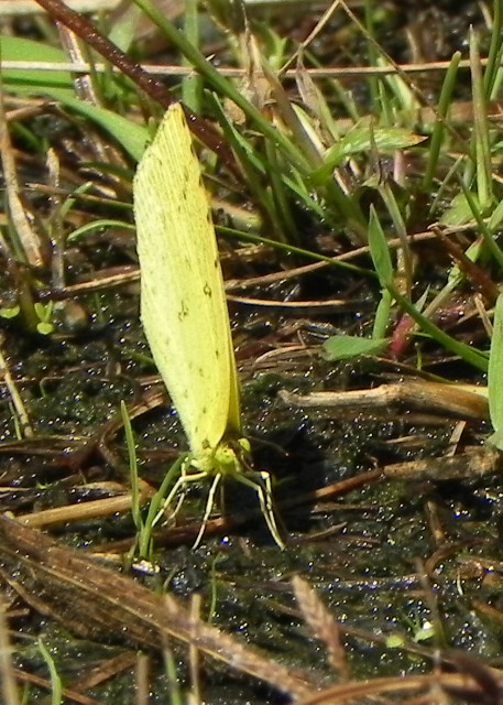 その代わり、到着時はカエルが盛んに鳴いていましたし、キチョウや秋のトンボと思われる小型のトンボを多く見かけました。キチョウの一部は、調整池の北側の水がにじんでいる道で給水していて、写真はそのうちの1頭になります。地面まで延ばされたストロー状の口がよく見えるのが珍しくて選んでみました。地面の色と近くてちょっと分かりづらいかもしれませんが、興味がありましたら、拡大して見てみてください。また、このキチョウたちに混じってモンシロチョウが1頭いたのですが、こちらは右後ろの羽を鳥か何かにつつかれてしまったのか、欠けていたみたいで、飛び方が不安定でした。写真を撮れないまま逃げられてしまったのが残念です。