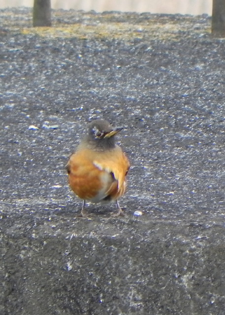 写真がそのアカハラで、胸の羽根が乱れているだけなら他の個体や鳥と戦った直後なのかと思いましたが、目の周りが白くなっているのはケガや換羽などではないように思います。ただ、病気ではないかという判断の根拠はそれだけで、飛び方がおかしいといった行動の異常は特になく、強いて言うなら、写真のように開けた場所に写真を7~8枚撮れるくらいいたことが少し珍しく思えたくらいです。でも、写真を撮っている間も体の向きを変えたり、頭を動かしたりしていましたから、まだ戦った直後で周囲を警戒していたのだとすればおかしなことではありません。寒さが一番厳しく、エサも少ない時季ですから、病気やケガをする個体が増えるのは自然なのでしょうけど、観察している鳥たちにはできるだけ元気に過ごしてほしいと思います。
