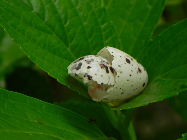 そのため、ちょうど色が付いてきてきれいだったアジサイの花を撮っていましたら、なぜか、スズメの卵を見付けました(写真)。割れ方から、無事に孵化できたあとの殻と判断しましたが、近くにスズメの巣があるとは思えない場所(上には高木が枝を差しかけていますが、スズメが巣をかけるような場所ではありません)なので、一体どうしてあの場所にあったのか不明です。スズメの親がわざわざ巣から遠く離れた場所まで殻を捨てにきたとは思いにくいですし、誰かがほかの場所で手に入れた殻をポイ捨てしたのでしょうか? 今夜からの台風4号の風雨でまたどこかへ行ってしまうと思いますが、スズメの卵をじっくり観察できたのは初めてで、貴重な経験になりました。