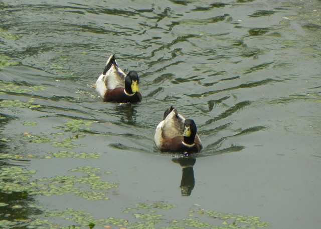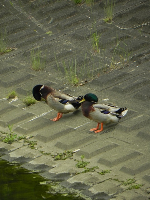 アイガモ兄弟は私がいる方へ向かって来るので、一瞬、私からエサをもらえると勘違いしたのだろうかとも思いました。でも、私の前をスルーしてそのままヨシやガマの茂みに行ったため、私に気付いてというより、バンに気付いて追い払う目的で泳いできて、一足先に隠れたバンを探すために茂みに向かったみたいでした。この見当がどこまで当たっているかは分かりませんが、茂みの中には入らないで北岸に戻ってきたアイガモ兄弟は、私を特別意識するわけでもなく、羽繕いを始めたので、少なくとも、私からエサをもらえると勘違いしたわけではなさそうです。