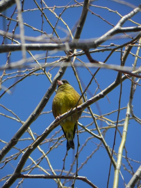 3つめは、カワラヒワの群れを見かけたことです。これは完全に帰り道で、場所も調整池に隣接する公園だったのですが、10羽くらいの群れで、そのうちの2羽ほどが木のてっぺんの方の枝に留まってさえずっていました。私の観察では、カワラヒワが群れになるのは春先という印象なので、この様子も「春が近いのかもしれないな」と感じさせました。